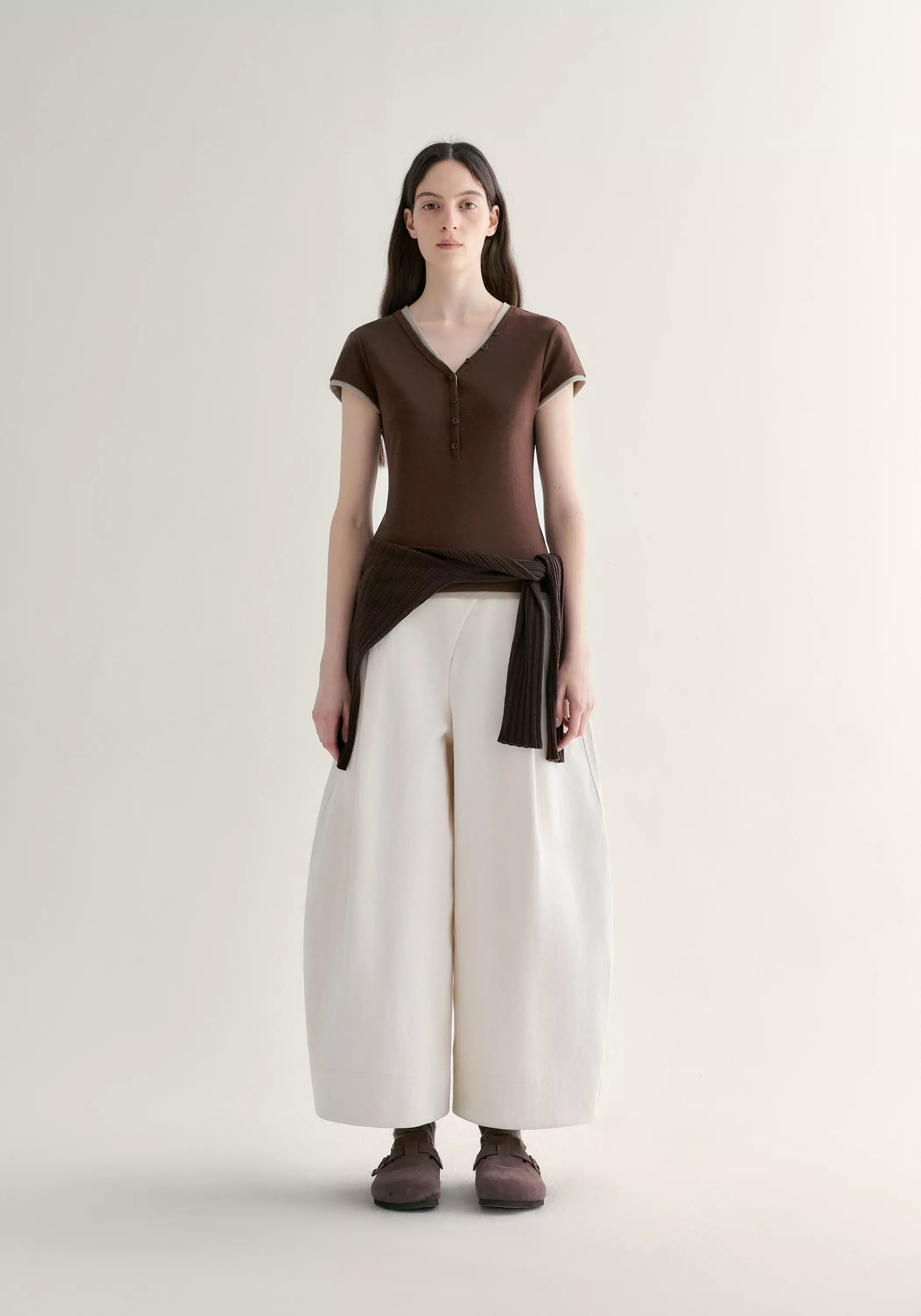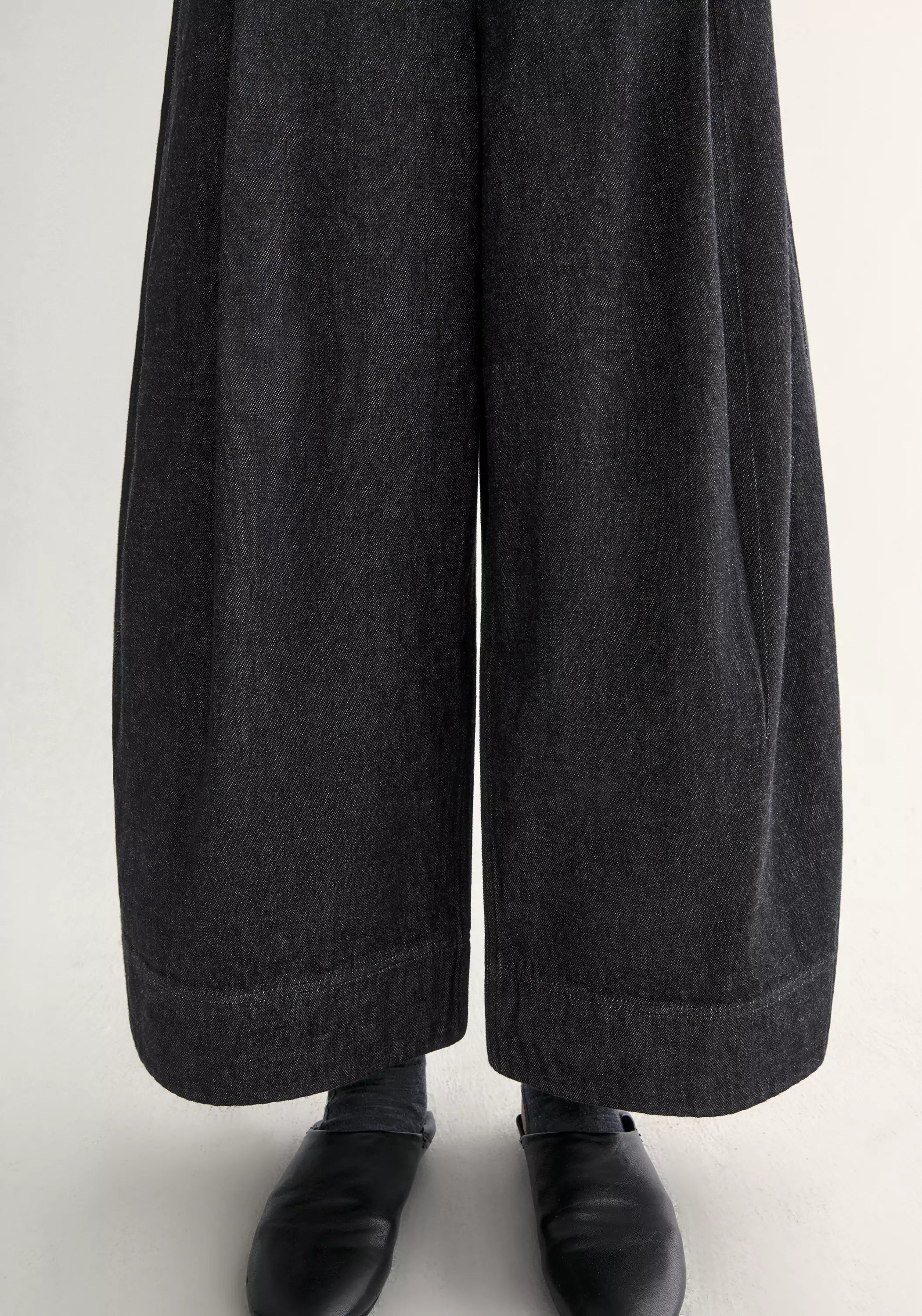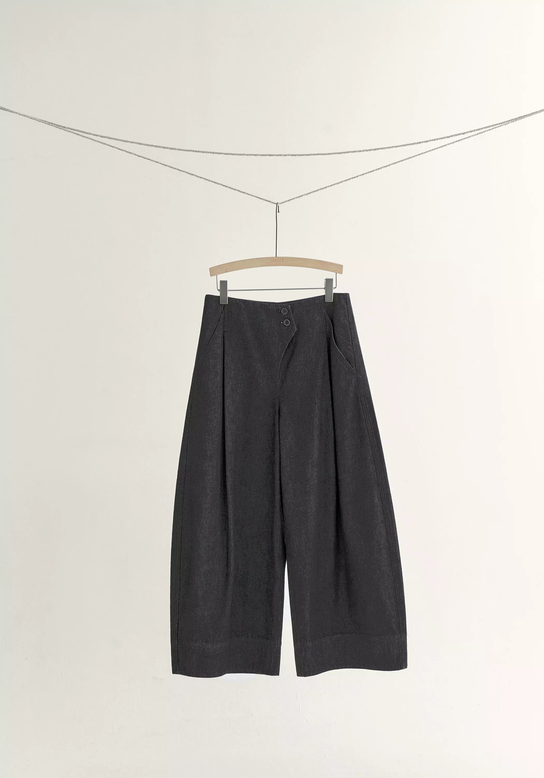 The pants are meticulously tailored from a refined blend of long-staple cotton, mulberry silk, and ramie, woven into a dense twill that feels both breathable and gentle against the skin. A vintage-denim inspired surface lends character, while the angled placket and triangular flap highlight subtle craftsmanship. Pleated pockets enhance the lantern-shaped silhouette, balancing structure with understated volume.